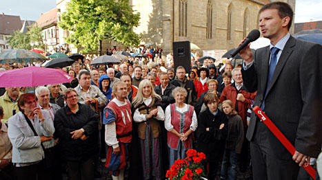 Lange müssen die drei Kandidaten ausharren im Regen vor dem Öhringer Schloss. Für 19 Uhr hat Kübler das Ergebnis angekündigt. 19.33 Uhr ist es, als das Martinshorn eines Feuerwehrautos der wartenden Menge auf dem Marktplatz signalisiert, dass das Warten ein Ende hat.