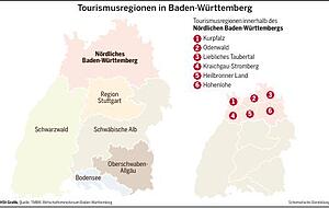 Man kann die groben Abgrenzungen aber trotzdem grafisch darstellen. Auf unserer Karte sind die sechs großen Tourismusdestinationen Baden-Württembergs genauso zu sehen wie die sechs Tourismusregionen mit ihren bestehenden Marken im nochmals separat hervorgehobenen Norden. Auf die dahinter stehenden Kreise haben wir verzichtet. Meist orientieren sich die Gebiete der TGs an den jeweiligen Kreisen. Kraichgau-Stromberg ist ein Verbund von Einzelkommunen und erstreckt sich über mehrere Kreise, der Rhein-Neckar-Kreis hat gar keine zentrale Tourismus-TG.