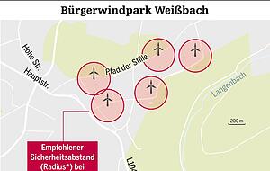 Darin empfehlen Experten die Formel: 1,5 mal (Rotordurchmesser plus Nabenhöhe). Das entspricht im Fall der Weißbacher Windräder einem Abstand von 394,5 Metern.