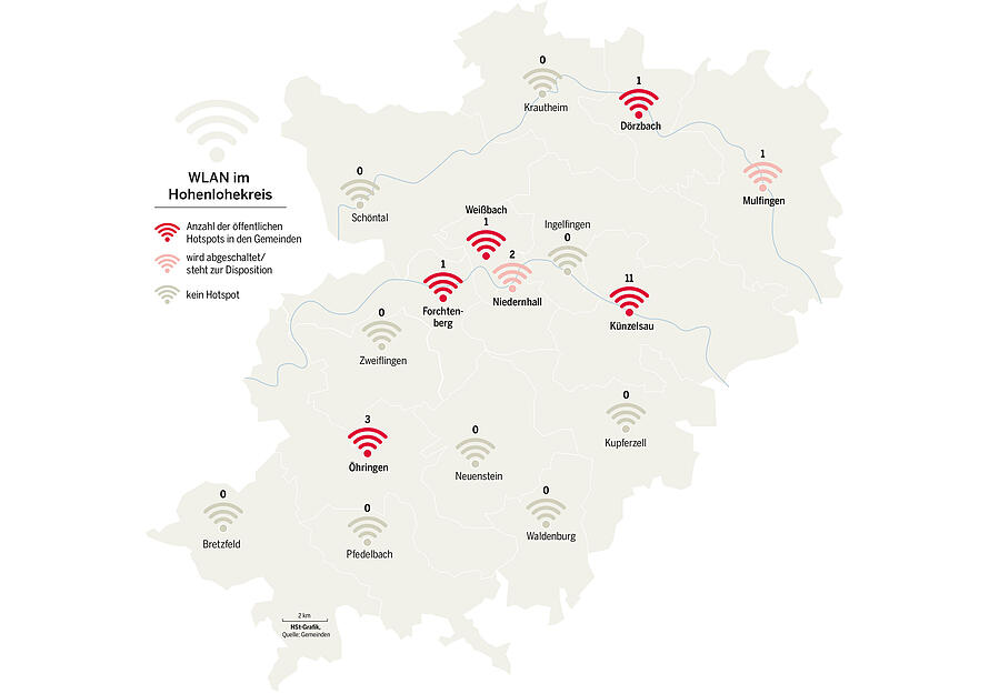 "Ich denke, das Konzept ist überholt. In unserer heutigen Zeit hat ein Großteil der Nutzer einen Vertrag mit ausreichend Datenvolumen", pflichtet Dörzbachs Bürgermeister Andy Kümmerle seinem Kollegen bei. "Der Empfang über mobile Daten ist auch in Dörzbach relativ gut." Öffentliches WLAN gibt es in der Jagsttalgemeinde rund ums Rathaus. "Das Signal lässt aber oft zu wünschen übrig und wird nach Rückmeldung meiner Mitarbeiter nicht mehr oft genutzt", so Kümmerle gegenüber der HZ. Generell seien auch keine weiteren Hotspots mehr geplant.