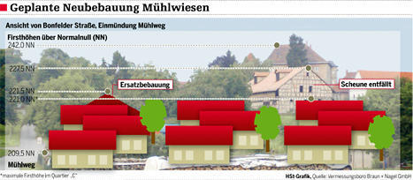 Völlig gegensätzliche Einschätzungen gibt es, was die Mühlwiesen angeht. Für Planer Braun soll mit dem ortsnahen Wohngebiet, in dessen Quartieren etwa 17 Einzelhäuser vorgesehen sind, eine innerörtliche Fläche genutzt und der Ortsrand abgerundet werden. Für Hahn handelt es sich aber aus historischer Sicht klar um eine außerörtliche Fläche: Der Ortsrand mit einer streng Nord-Süd-gerichteten Baukante sei über Jahrhunderte überliefert, das leicht nach Osten verschobene Schloss herausgehoben. Die Situation sei eindrucksvoll und im Heilbronner Land selten gut überliefert vorhanden. Hahn gesteht zwar zu, dass über die Dächer der geplanten Wohnhäuser ein Blick aufs höher liegende Schloss möglich sei. Die Bebauung führe aber zum Verlust der dominanten Stellung des Schlosses − ein "prägendes Kennzeichen für die Ritterlandschaft Neckarraum" und ein "charakteristisches Stück Ortsidentität".