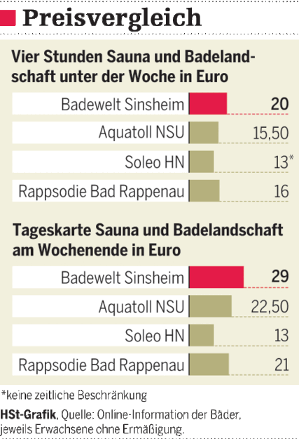 Weitere Bäder der Region hat stimme.de in einer Tabelle zusammengestellt. Den Preisvergleich mit Multi-Sauna-Komplexen, die eine ähnliche Vielzahl an thematischen Schwitzkabinen aufweisen, muss das Sinsheimer Bad allerdings nicht scheuen. In den Stuttgarter Schwabenquellen im SI-Centrum sind für vier Stunden 27,30 Euro fällig.
