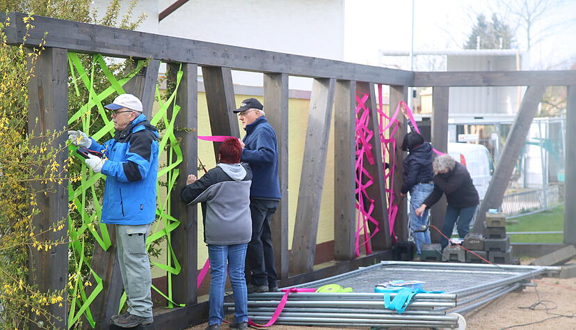 „Wir spannen die Bänder in den Gefachen der Fachwerkwände.“ Diese Fachwerkwände stehen auf dem Auftaktplatz und stellen den Bezug zwischen der Gartenschau und der Fachwerkstadt her. Diejenigen, die an diesem Morgen der Witterung trotzen und die Arbeitshandschuhe herausgeholt haben, erhalten so ganz nebenbei einen exklusiven Blick auf den Auftaktplatz und die Umgestaltung des Altstadtrings für die Zeit während der Gartenschau. Mehrere große Beete mit Holzeinfassungen, bis unter den Rand mit Erde gefüllt, warten darauf, bepflanzt zu werden. Nichts erinnert daran, dass hier bis vor gut zwei Jahren Fahrzeuge und Wohnmobile geparkt haben.