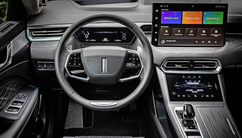 Betont mainstreamig ohne designerische Eskapaden ist der Wey 03 gehalten - einzig der üppige Chromgrill oder das vertikale dritte Bremslicht stechen hervor. Auf ein Markenlogo am Heck wird verzichtet. Im sauber verarbeiteten Innenraum erwartet Passagiere ein sorgfältig ausgewählter Materialmix mit feinem Alcantara, gestepptem Leder und weichen Oberflächen. Massagesitze, Surround-Sound von Infinity (mit verchromten Lautsprechergittern) und gleich drei Bildschirme sorgen für einen Premium-Charakter. Das erste Display versteckt sich aber hinter dem Zweispeichen-Lenkrad und fällt unter die Kategorie Mäusekino - da braucht es gute Augen. Der zweite Monitor ist schräg ansteigend in der Mittelkonsole platziert und dient zur Klima- und Sitzsteuerung. Sieht schick aus, ist im Gegensatz zu klassischen Drehrädchen aber nicht intuitiv bedienbar, sprich: Man muss immer hinschauen. Beherrscht wird die digitale Szenerie vom 14,6 Zoll großen Infotainment-Tablet - und abgerundet wird das Ganze durch ein Head-up-Display.