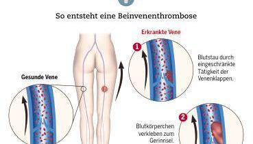 Das Thrombose-Risiko beginnt bei einer Reisedauer von etwa vier Stunden und steigt mit der Zeit an. Bei Bewegung wirkt die Wadenmuskulatur wie eine Pumpe, die den Rückfluss des Blutes zum Herzen beschleunigt. Steht die Pumpe zu lange still, verlangsamt sich der Blutfluss in den Beinen. In der Vene können Gerinnsel entstehen, die sich lösen und mit dem Blutstrom in die Lunge gelangen können. Verstopfen sie dort die Arterien, kommt es zu einer Lungenembolie, Betroffene bekommen keine Luft mehr. Es kann zu einer plötzlichen Überlastung des Herzens mit der Gefahr eines Herzstillstandes kommen.