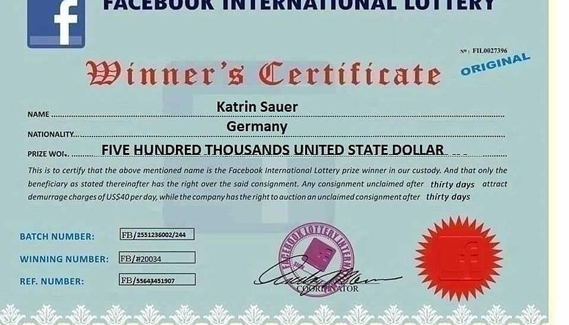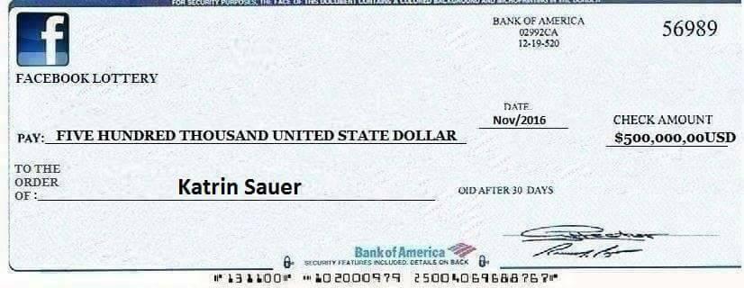 Angeschrieben wurde sie von "Tina Patton", deren Nachricht lautete: Katrin Sauer habe in der Facebook Lotterie 500.000 US-Dollar gewonnen. Anbei versendete Patton Zertifikat und Scheck - versehen mit Katrin Sauers Namen. Die nächste Mail erhielt sie von "Mr Mark Zuckerberg Elliot", dass es sich hierbei um ein Fake-Profil handelt, war Katrin Sauer nicht bewusst. Der angebliche Mark Zuckerberg sollte die Echtheit der Lotterie deutlich machen. Der Scheck läge wohl in den USA am Abholen bereit. Katrin Sauer ist nicht weiter auf die Anfragen eingegangen, im Gegensatz zu anderen Usern.