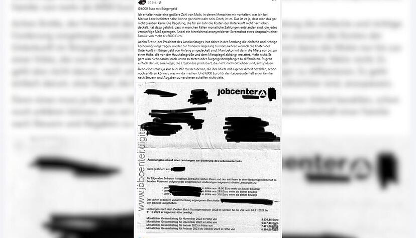 Palmer: Es gibt eine Regelung aus der Corona-Pandemie, die sagt, die tatsächliche Miete wird unbegrenzt bezahlt. Das war damals sinnvoll, jetzt führt es zu Missbrauch. Und zwar nicht durch Bürgergeldbezieher, sondern clevere Vermieter. Dem muss ein Riegel vorgeschoben werden. Um das zu dokumentieren, hab ich gesagt, ich kenne Bescheide mit über 6000 Euro für einzelne Familien. Das kann man arbeitenden Menschen in diesem Land nicht erklären. Fast kein Familienvater bringt 6000 Euro netto nach Hause. Deswegen ist die einfache Forderung, zurück zur Regel vor der Pandemie. Nur die angemessene Miete wird bezahlt, nicht die tatsächliche, egal wie hoch sie ist. Und das scheint mir weder populistisch noch unangemessen noch irgendwie unsozial zu sein, sondern schlicht notwendig.