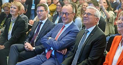 Kein Jubel, stattdessen rhythmisches Klatschen zur Einlaufmusik, Hände schütteln rechts und links auf dem Weg zur Bühne: Es ist eine entspannte Ankunft von Bundeskanzler Friedrich Merz am Freitagabend in Bad Rappenau. Dann steht er oben auf dem Podium und der Applaus brandet doch noch auf.