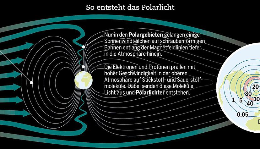 Da das Erdmagnetfeld in Richtung Nord- und Südpol ausgerichtet ist, strömen die Teilchen dorthin. Beim Eintreffen in die Erdatmosphäre kollidieren die Sonnenteilchen mit Sauerstoff- und Stickstoffmolekülen in der Lufthülle der Erde. Dadurch wird Energie übertragen, die in Form der schillernden Polarlichter wieder frei wird. Das Polarlicht ist also eine Leuchterscheinung durch angeregte Sauerstoff- und Stickstoffmoleküle. Wenn der Sonnenwind das Magnetfeld der Erde verschiebt, "sehen wir die Aurora (das Polarlicht) tanzen", erklärt Kerste.