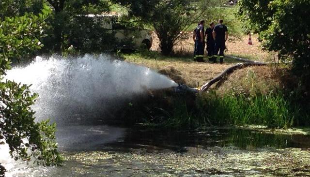 Seit neun Uhr spritzt die Feuerwehr Frischwasser in die Jagst, um den Sauerstoffgehalt anzureichern. Damit hoffen die Experten, die ammoniumverseuchte Wasserblase aufzulösen, die seit Samstagnacht in der Jagst treibt und den gesamten Fischbestand tötet. Gleichzeitig wird versucht, über die Kläranlagen so viel Wasser wie möglich aus dem Fluss zu nehmen und durch Frischwasser aus dem Kocher zu ersetzen. Doch auch dabei sind die Kapazitäten begrenzt. Das aktuelle Niedrigwasser erschwert die Situation.