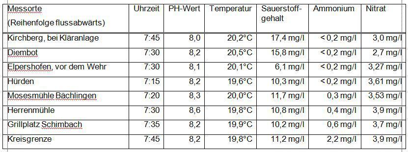 Der Ammonium-Wert ist ab 0,5 bis ein mg/l tödlich für Fische und andere Lebewesen in der Jagst. Normal ist ein Wert in der Jagst mit 0,04 mg/l. Bei Nitrat liegt der Grenzwert für Trinkwasser bei 50 mg/l.