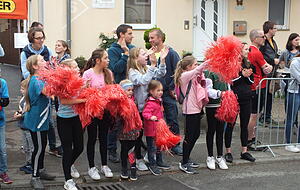 Am lautesten dringt die Stimme von Starter Adrian Gieseler zu der Läufern. „Habt ihr Lust zu laufen?!“ ruft er einmal, zweimal, dreimal in die Menge. Ein vielstimmmiges „Ja!“ bekommt er als Antwort zurück. Der Countdown beginnt und als der bei Null angekommen ist, knallt pünktlich um 11 Uhr der Startschuss für die rote Gruppe. Der Pulk von mehreren hundert Läufern strömt durch das Starttor und bewegt sich in Richtung Schmidhausen. Eine Gruppe junger Mädchen betätigt sich am Straßenrand als Cheerleader und feuert mit ihren roten Puscheln die Sportler an.