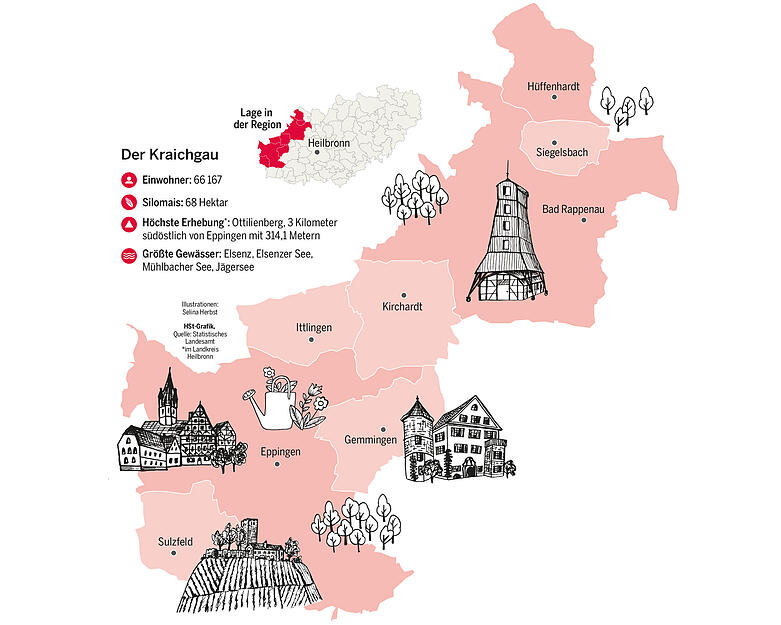 Im Kreis Heilbronn ist der Eppinger Ottilienberg mit 314 Metern der höchste Punkt des Kraichgaus. Das Herz der geschichtsträchtigen Landschaft schlägt westlich davon. Thomas Adam selbst legt seinem Buch "den großen Kraichgaubegriff zugrunde". Eine Definition, wie er schreibt, "die als Kraichgau alles das versteht, was zwischen dem Neckartal im Osten und Norden sowie den Ausläufern des Schwarzwaldes - auf einer Linie von Ettlingen nach Birkenfeld und dann der Enz folgend bis Besigheim - im Süden liegt. Den Abschluss im Westen markiert die Geländestufe entlang der Grabenrandverwerfung zur Oberrheinischen Tiefebene hin."