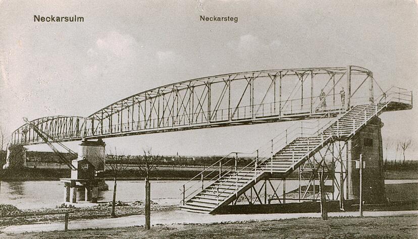 Mit dem Steg hat sich auch der Neckarsulmer Heimatforscher Gerhard Mannheim beschäftigt. Diese Eisenkonstruktion sei ein Teil des Neckarsulmer Neckarstegs gewesen. "Er wurde 1907 als Fußgängerbrücke erbaut und ersetzte die bis dahin betriebene Fähre." Anfang der 1920er Jahre sei dieser Steg mit dem Bau der Wehr- und Kanalbrücke überflüssig und daher 1924 abgebaut worden. "Eine Hälfte der Eisenkonstruktion wurde von zwei miteinander verbundenen Schleppkähnen etwa drei Kilometer flussabwärts transportiert, wo sie auf zwei neu errichtete Betonpfeiler aufgesetzt wurde."
