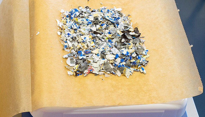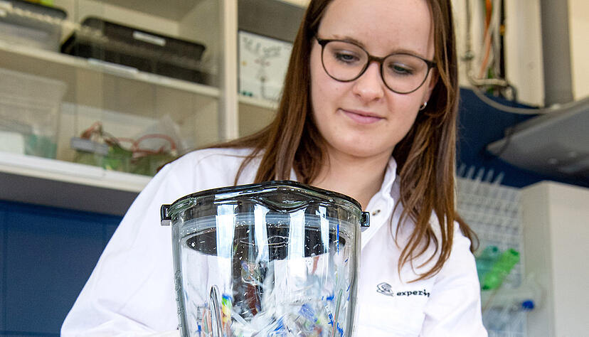 2. Anschließend füllt sie die Kunststoffstücke zum Schreddern in einen Mixer.