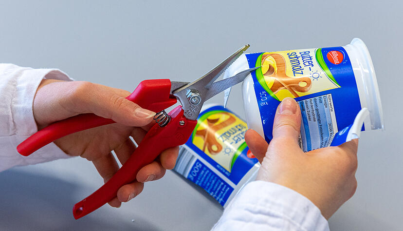 1. Muriel schneidet die Verpackungen mit einer Rebschere in drei bis vier Zentimeter große Stücke.