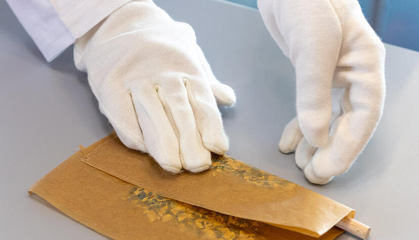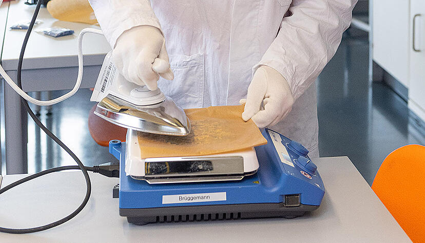 3. Auf einer heißen Heizplatte werden die Plastikteilchen auf einem Stück Backpapier positioniert.