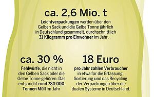 Denn was gehört in den gelben Sack und die gelbe Tonne? Damit tun sich viele Verbraucher auch heute, 30 Jahre später, noch immer schwer. Warum genau, fragt sich auch Axel Subklew. „Eigentlich ist es einfach: Wir sammeln im Gelben Sack gebrauchte und restentleerte Verpackungen, die nicht aus Papier, Pappe, Glas oder Karton sind.“ Beispielsweise Milchkartons, Nudeltüten, Shampooflaschen oder Senftuben. Und doch fischen die Mitarbeiter in den Sortieranlagen noch immer kuriose Dinge aus den Gelben Säcken und Tonnen: Planschbecken, die Gelbe Tonne an sich und sogar tote Katzen. Bei rund 2,6 Millionen Tonnen Materialien, die in Deutschland über die Gelben Säcke und Tonnen gesammelt werden, liegt der Anteil der nicht richtig entsorgten Abfälle bei durchschnittlich 30 Prozent. „Das erschwert uns nicht nur den Sortier- und Recyclingprozess, sondern auch, die Recyclingquote zu erfüllen“, sagt Axel Subklew. Deshalb sei es wichtig, dass „wir weiter permanente Aufklärungsarbeit leisten und viele Mythen um die Mülltrennung aufklären". Denn: „Recycling ist ein wichtiger Beitrag zum Klimaschutz und kann jährlich rund 3,1 Millionen Tonnen CO2-Äquivalente einsparen.“