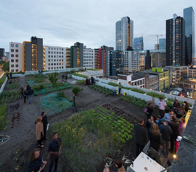 Rotterdam ist eine Stadt mit vielen Hochhäusern – und Flachdächern. Eine ganze Reihe davon sind inzwischen zu grünen Dächern umgebaut, wie der DakAkker, ein 1000 Quadratmeter großer Dachgarten auf dem Schieblock-Hochhaus. Neu entstehende Flachdächer müssen multifunktional sein: Sie werden begrünt, als Wasserspeicher ausgelegt oder zur Erzeugung von Solarenergie genutzt – manchmal sind auch alle drei Funktionen kombiniert. Solche Dächer absorbieren CO2 und dienen als Wasserspeicher, Frischluftreservoir und Erholungsgebiet für die wachsende Stadtbevölkerung.