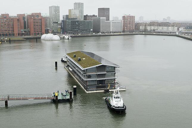 Ein schwimmendes Büro aus Holz entsteht gerade im Rijnhaven von Rotterdam. Es ist nachhaltig, energieneutral und dient dem Global Center on Adaption als Hauptsitz. Die Idee: Das Gebäude schwimmt auf dem Wasser, statt geflutet zu werden, wenn die Pegel als Folge der Klimaerhitzung steigen. Das Projekt ist funktional und soll gleichzeitig innovativer und kreativer Ankerpunkt in dem Hafengebiet sein, das neu entwickelt wird. Das hölzerne Büro ist so konstruiert, dass es abgebaut und an einem neuen Ort wieder aufgebaut werden kann – eine ressourcenschonende Idee der Kreislaufwirtschaft.
