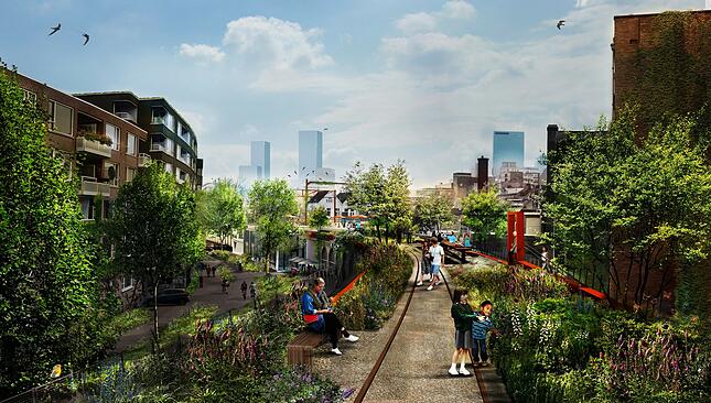Der Hofbogen ist eine frühere Bahnlinie, die durch dicht besiedeltes Stadtgebiet verläuft und die bislang eine Art Trennlinie zwischen dem Norden von Rotterdam und der Innenstadt dargestellt hat. Mit dem Hofbogenpark soll sich das ändern. Auf einer Länge von zwei Kilometern entsteht eine städtische Grünachse. Dadurch soll die Lebens- und Aufenthaltsqualität im bisher eher vernachlässigten Norden steigen. Das Thema Wasserrückhaltung wird durch ein smartes Wasser-Kreislaufsystem adressiert. Weiteres Ziel: eine gute Verbindung für Fußgänger zwischen den Stadtteilen schaffen.
