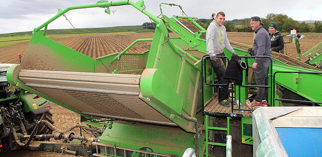 Mit einer Arbeitsgeschwindigkeit von drei bis vier Kilometern pro Stunde und einer Arbeitsbreite von 1,5 Metern ist die „AVR zweireihig“ in der Lage, jeden Tag etwa drei Hektar Kartoffeln aus dem Acker zu holen. „Mit der Vorgängertechnik, dem einreihigen Kartoffelroder, hat man vielleicht 30 Ar pro Tag geschafft“, überschlägt Samuel Muth, der den Betrieb „Kartoffelhof Muth“ gemeinsam mit seinem Vater Alfred führt.