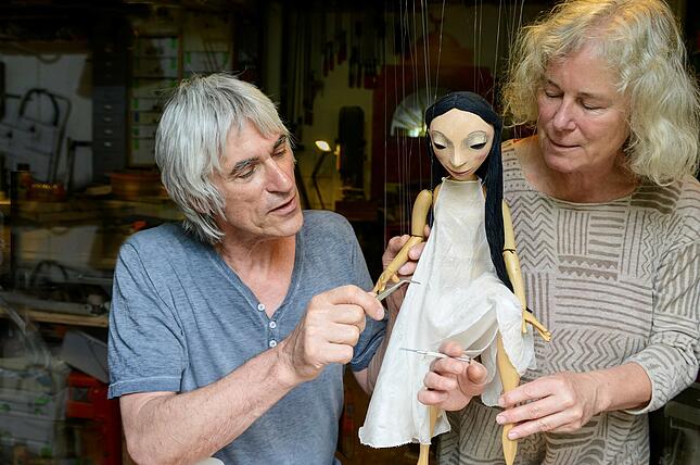 „Eine Marionette ist gebaut, um gespielt zu werden“, sagt Detlef Schmelz. Und deshalb bauen er und seine Frau Marlene Gmelin nicht nur, sie spielen ihre Kunstwerke auch. Und zwar zumeist in eigenen Inszenierungen. Pendel-Marionetten steht demnach einerseits für eine winzige Manufaktur, die für ihre fantasievollen und kunstfertig gestalteten Figuren mehrfach ausgezeichnet wurde, andererseits für poetisches, international erfolgreiches Marionetten-Theater. Ganz nebenbei geben die beiden Künstler auch Spielkurse.