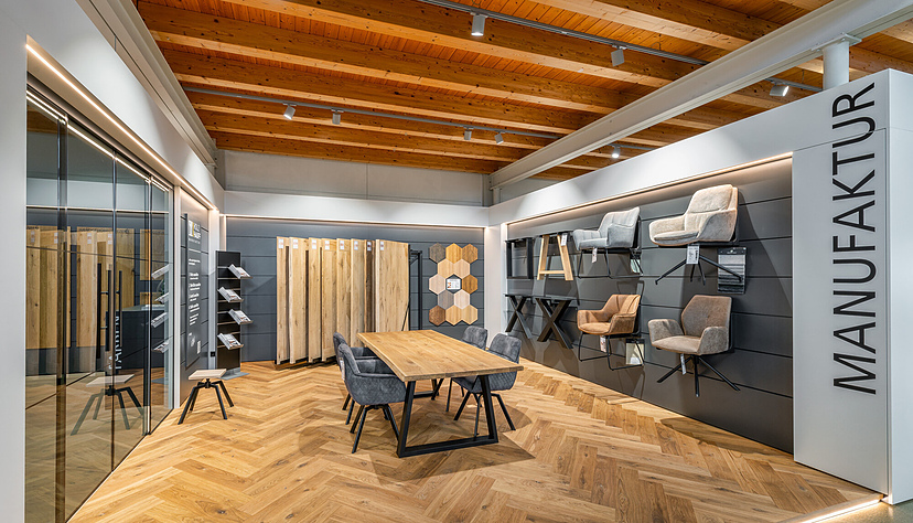 Auf inspirierende Weise zeigt Hauff, wie individuell ein Tisch sein kann: In der Ausstellung gibt es Tischplatten aus hochwertiger Eiche in verschiedenen Formaten und Oberflächen, robuste und elegante Gestelle aus Holz, Metall oder Edelstahl sowie eine große Auswahl an passenden Stühlen. Besucherinnen und Besucher können ihren Tisch in einem Vier-Schritte-Konzept konfigurieren – von der Wahl der Platte über die Oberfläche mit Rubio-Monocoat-Öl bis hin zu Gestell und Stühlen. „Uns ist wichtig, dass jeder Kunde in Ruhe seinen ganz persönlichen Tisch gestalten kann. Wir beraten individuell und ohne Zeitdruck“, erklärt Terzi.