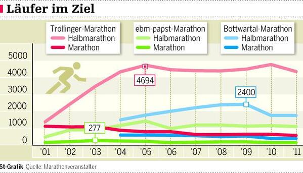 Die Gründe für den Rückgang sind vielfältig. "Die Leute möchten sich nicht mehr so quälen", bedauert Bernhard Winkler, Cheforganisator von der Heilbronn Marketing Gesellschaft. Im Vergleich zum ersten Trolli 2001 wollten sich 2011 nur noch die Hälfte der echten Marathoniken die ganze Distanz zumuten. Im gleichen Zeitraum haben sich dagegen die Starterzahlen für den Halbmarathon verdreifacht. Der Trollinger-Marathon entwickelt sich so mehr und mehr zum Volkslauf. Wo ist die Schmerzgrenze erreicht, unter der sich der Einsatz und der Organisationsaufwand für die Marathonstrecke noch lohnen? Winkler antwortet: "Wenn wir noch mal 20 Prozent der Marathonläufer verlieren."