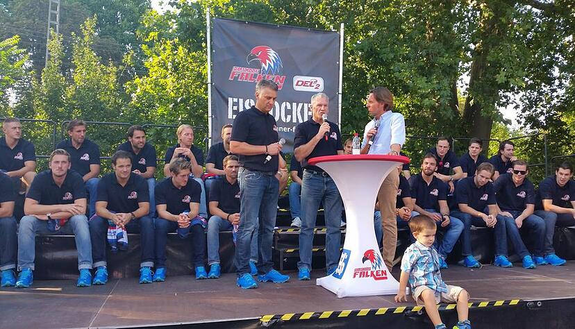 Mit dem traditionellen Stadionfest sind die Heilbronner Falken offiziell in die Saison gestartet. Hunderte Fans waren am Samstagnachmittag bei schönem Spätsommerwetter zur Kolbenschmidt-Arena gekommen. Bei Grillgut und Getränken wurde das Team für die DEL-2-Saison 2015/16 vorgestellt, zudem das neue Trikot präsentiert. Anschließend durften die Fans gemeinsam mit ihren Lieblingen aufs Eis zum Schlittschuhlaufen. son