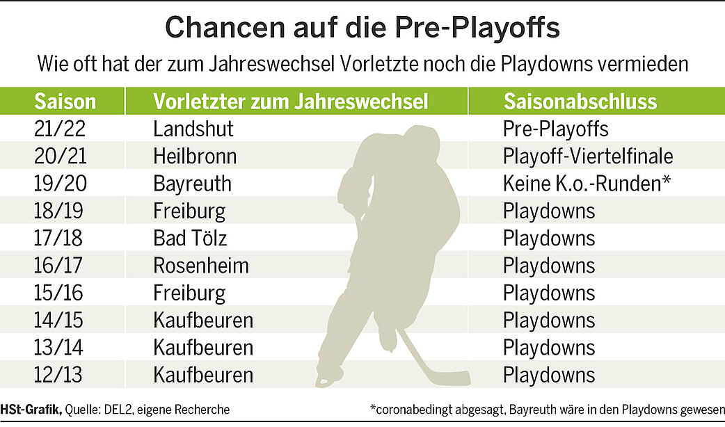 Dort war dann mit einer Rumpftruppe Endstation gegen die Kassel Huskies. In der vergangenen Saison schaffte es der EV Landshut von Platz 13 zum Jahreswechsel als Zehnter noch in die Pre-Playoffs. Dort scheiterten die Bayern ausgerechnet an den Falken. In den acht Spielzeiten zuvor landete der Vorletzte aber zielsicher in der Abstiegsrunde.