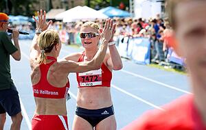 Den Erfolgstag für die TSG Heilbronn komplettiert Bettina Englisch. Die Stockheimerin jubelt über die Halbmarathon-Distanz - und hat nach 1:19:30 Stunden noch ausreichend Power für Küsschen, Umarmungen und Gratulationen. "Es ist toll, wenn man in sein Stadion einläuft", sagt Bettina Englisch, "ich mag es einfach in der Heimat zu laufen. Man kennt alles, das motiviert mich." Die 44-Jährige hat am Sonntagmorgen zudem einen respektablen Vorsprung von knapp acht Minuten auf Sandra Burkhardt (1:27:12).