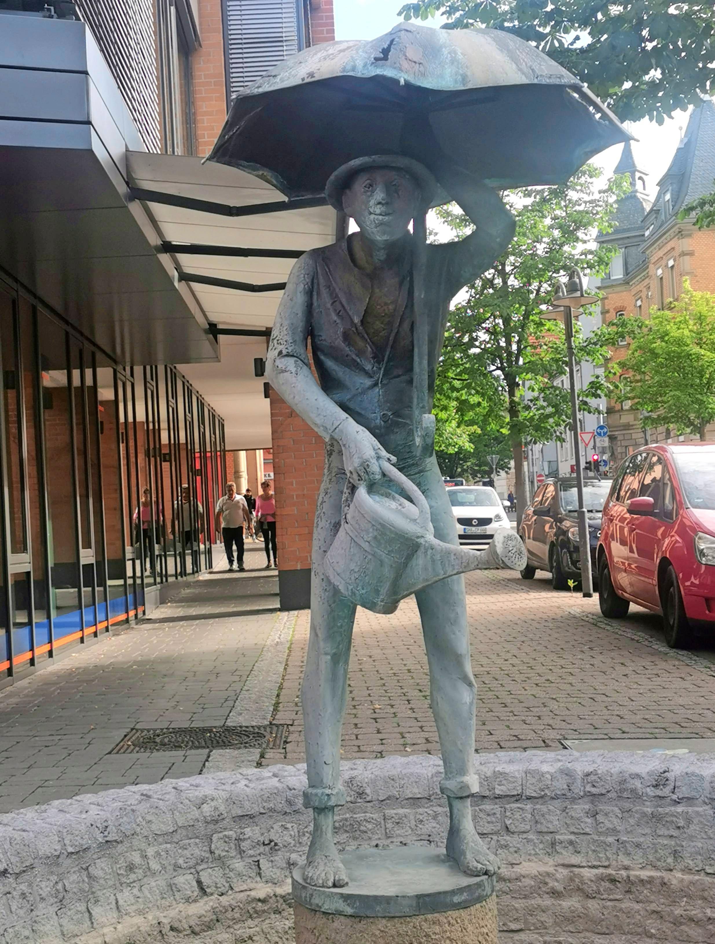 Ob dem Hamballe frischer Wind gut tut? Der Skulptur in der Bahnhofstraße dürfte das wohl egal sein. Von Künstler Hermann Koziol bildhauerisch gestaltet, fand der liebenswerte Geselle als Bronzefigur 1986 seinen festen Platz mitten in Hamballingen. Und hier in seiner heimatlichen Residenz residiert der „Urtyp hochgeistiger Einfalt“ mitten in einem Brunnen und bringt seine Betrachter zum Schmunzeln: Mit seinem Schirm schützt er sich vor dem Regen und gießt dabei die Blumen.