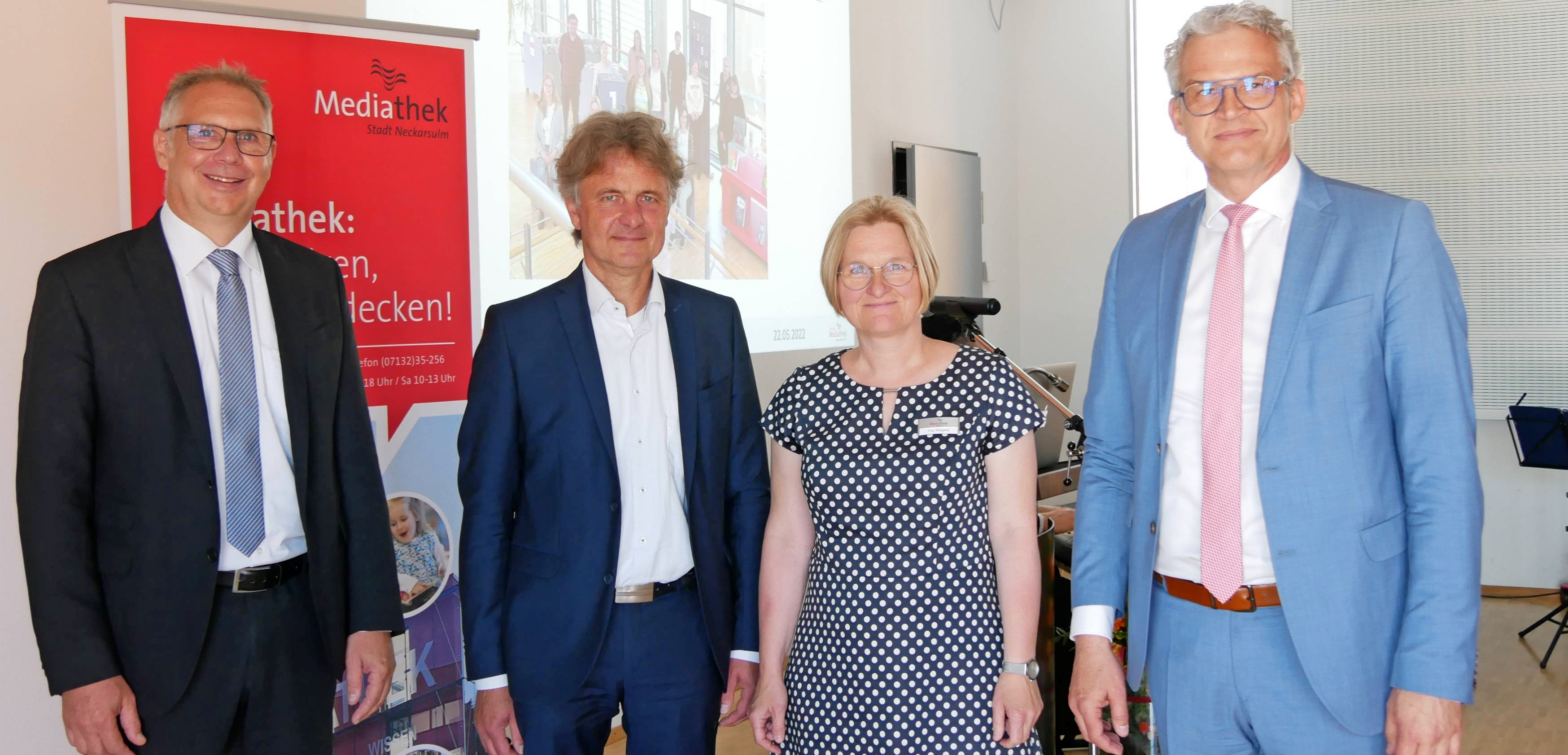 Grundlegender Auftrag Diesem Auftrag ist die Mediathek Neckarsulm seit 100 Jahren treu geblieben. Nachdem das runde Jubiläum im vergangenen Jahr wegen der Corona-Einschränkungen nicht gefeiert werden konnte, wurde die Geburtstagsfeier jetzt mit einer öffentlichen Matinee in der Mediathek nachgeholt. Ehrengast und Festredner war der Oberbürgermeister der Stadt Karlsruhe, Dr. Frank Mentrup, Präsident des Deutschen Bibliotheksverbands (dbv) und Vorsitzender des dbv-Landesverbandes Baden-Württemberg. Die Mediathek hat sich in 101 Jahren sehr verändert, wie OB Steffen Hertwig feststellte. „Ihr grundlegender Auftrag jedoch nicht.“ Öffentliche Bibliotheken sichern laut Hertwig bis heute den freien, unzensierten Zugang zu Wissen, Information und Bildung für alle Menschen und damit die Grundlage für Meinungsfreiheit und Demokratie. Die Mediathek sei ein wichtiger Partner für Kitas und Schulen und fördere die Lesefähigkeit und Medienkompetenz. Als Lern-, Arbeits- und Aufenthaltsort biete sie die technische Infrastruktur und ermögliche so die Teilhabe an der digitalen Gesellschaft. Die Mediathek bereichere zudem das kulturelle Leben der Stadt und leiste einen wichtigen Beitrag für eine lebendige Innenstadt. „Sie ist Begegnungsfläche für Menschen aller Altersgruppen, aller sozialer Schichten und kultureller Hintergründe.“ Mit diesen Funktionen sei die Mediathek aus der Stadtgesellschaft nicht mehr wegzudenken, erklärte der Oberbürgermeister. „Heute ist die Mediathek eine fest verankerte Säule des öffentlichen Lebens in der Stadt.“