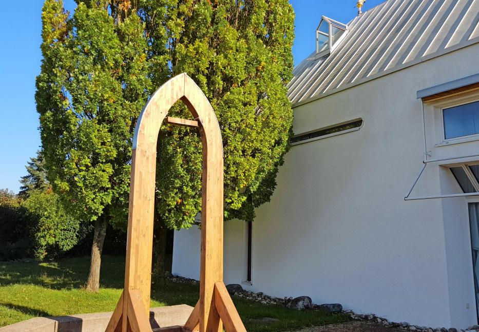 Die Glocke soll dort jedoch nicht mehr an dem 400 Kilo schweren Glocken-Holzträger aufgehängt werden, sondern an einem Stahlträger im gotischen Stil über dem Flachdach auf der Kirchenterrasse. Der Glockenträger findet neben drei Säuleneichen als eigenständige Skulptur einen Platz.