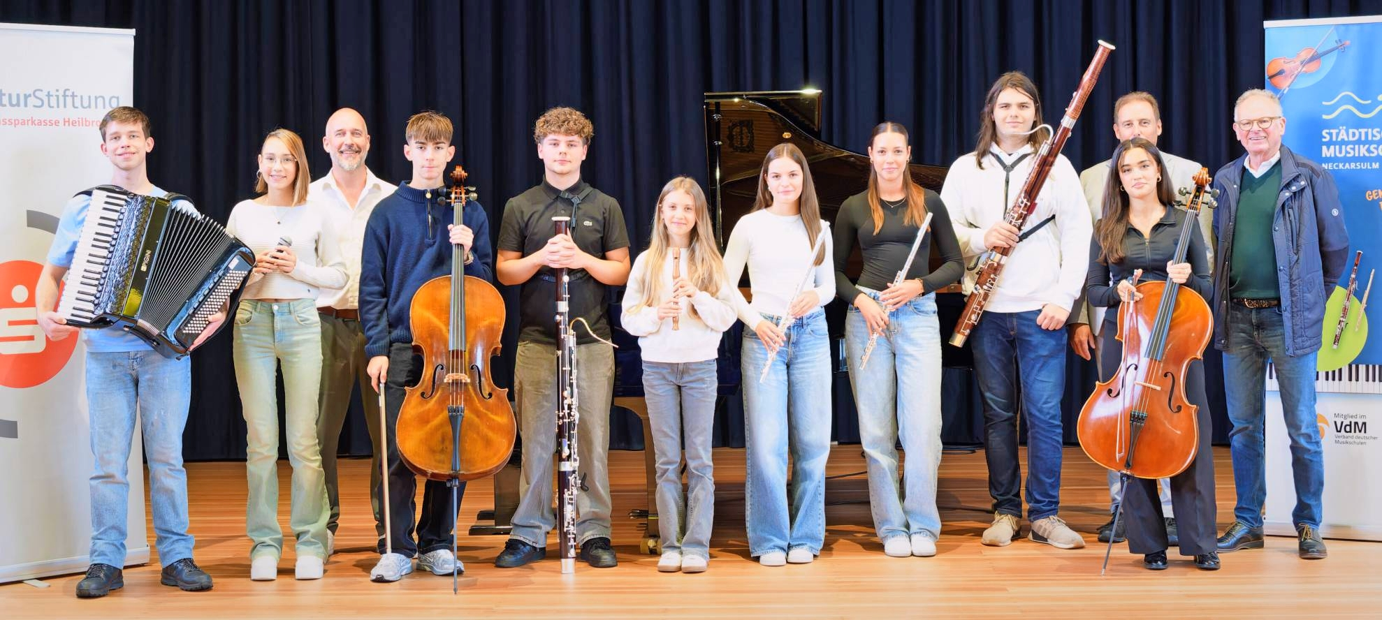 Neun Schülerinnen und Schüler der Städtischen Musikschule Neckarsulm haben sich im Schuljahr 2025/2026 für die "Pre-SVA“ (Studienvorbereitende Ausbildung) qualifiziert. Dazu gehören: Alexander Blazevic, Akkordeon (Klasse Galina Grigorjan), Lea Nagel, Gesang (Klasse Andrea Voit-Erlewein), Maximilian Hamburg, Violoncello (Klasse Sebastian Erlewein), Philipp Oberländer, Fagott (Klasse Carl von Houwald), Philipa Busam, Blockflöte (Klasse Andrea Buchert-Kwasnitza), Marie Kühner und Jana Fortner, Querflöte (beide Klasse Ulrike Pobuda), Silvan Zinẞer, Fagott (Klasse Carl von Houwald) und Efsa Yilmaz, Violoncello (Klasse Sebastian Erlewein).