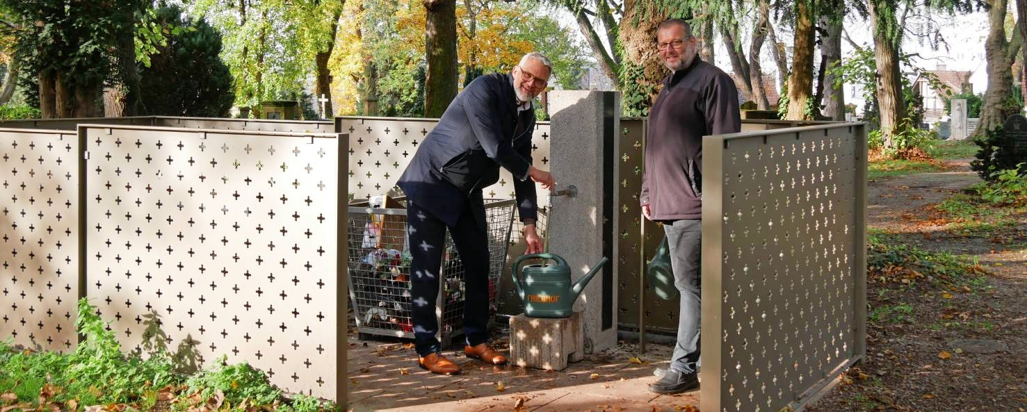 Leichter fällt künftig auch die Pflege der Gräber. Dafür sorgen die neu geordneten und einheitlich gestalteten Ver- und Entsorgungsstationen. In zwölf Stationen, die flächendeckend über den gesamten Friedhof verteilt sind, werden alle wichtigen Nutzungen gebündelt. Dort finden Besucher Wasserstellen, Gießkannenhalter und die Abfallbehälter für Grün- und sonstige Abfälle. Neue einheitliche und transportable Drahtkörbe mit Ein-Kubikmeter-Volumen ersetzen die alten, unansehnlichen Grünabfall-Container, die früher überall auf dem Friedhof verstreut waren.