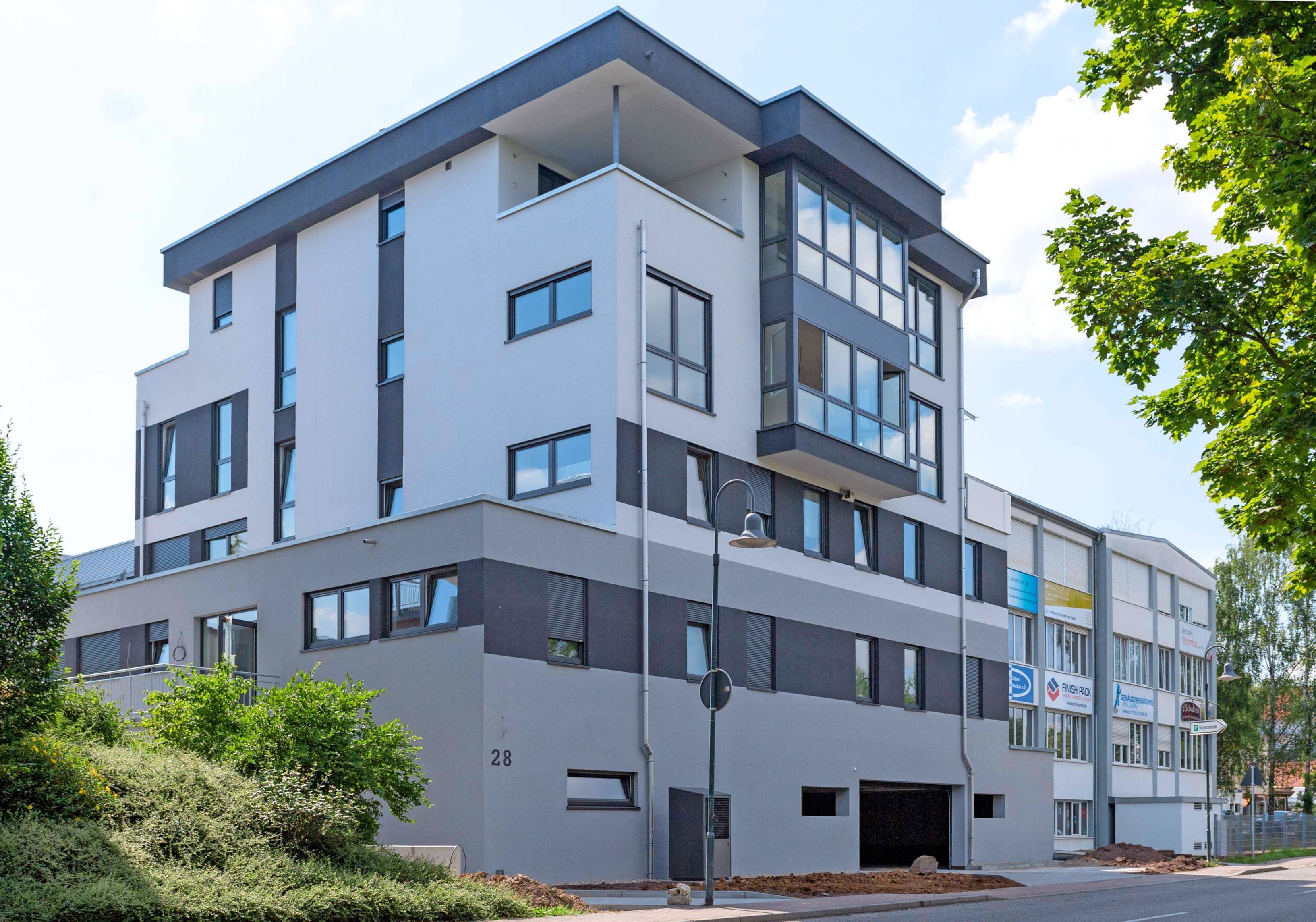 Geradlinige Architektur Das Gebäude gegenüber dem Bürgerzentrum-Parkplatz hat eine sachliche, geradlinige Architektur. Die Gebäudehülle ist nach den neuesten energetischen Vorgaben ausgeführt. Die Haustechnik verfügt über eine Luftwärmepumpe, einer PV-Anlage zur Eigennutzung im Mieterstrommodell. Die Praxisräume sind klimatisiert und haben eine Be- und Entlüftungsanlage.