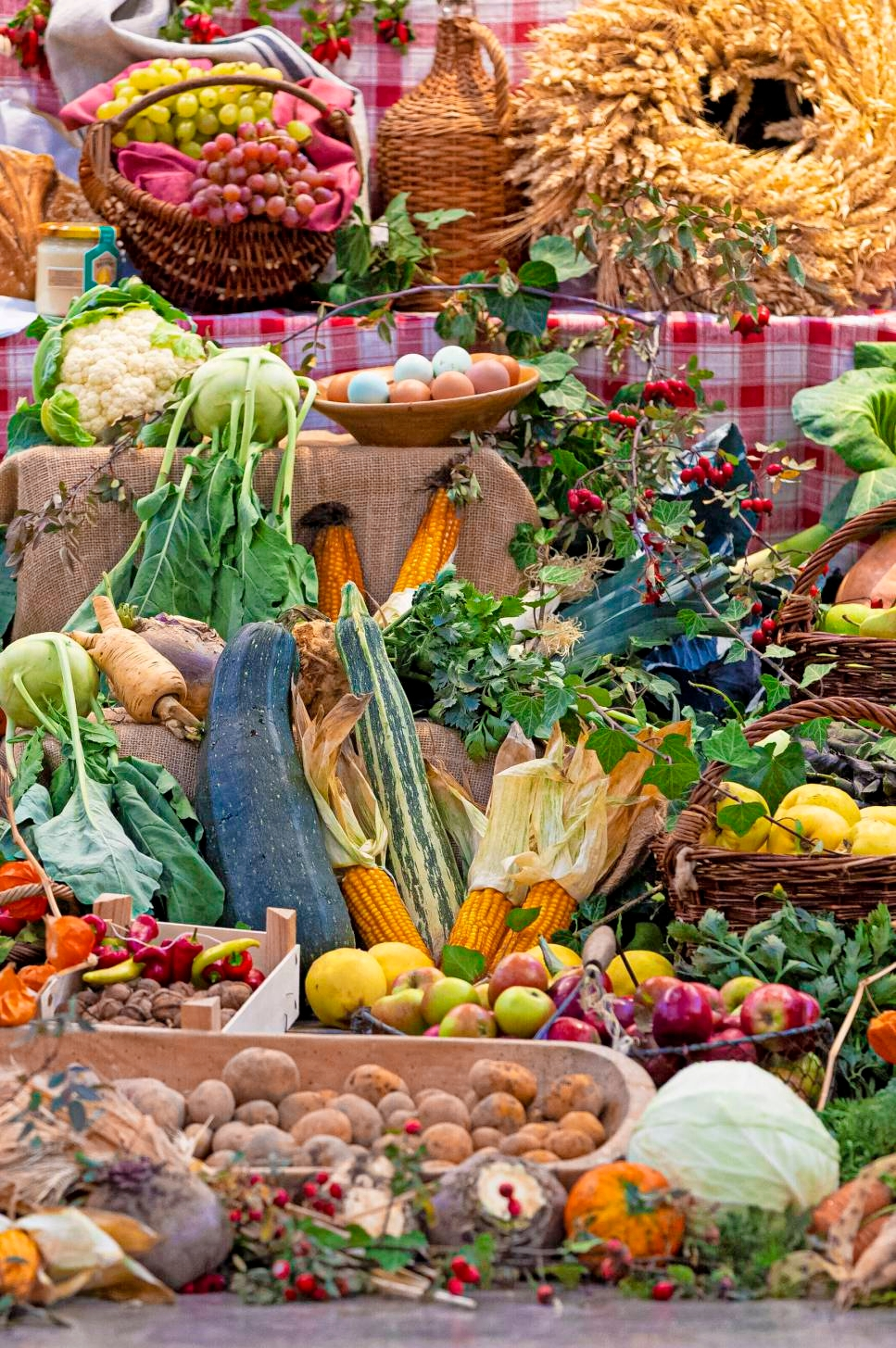 Denn mit Obst und Gemüse aus heimischer Produktion ist der Tisch reich und vielfältig gedeckt: Im Angebot sind süße Trauben, rotbackige Äpfel, saftige Birnen und schmackhafte Quitten. Kohl in jeder Variation, Rote Bete, Sellerie, Kartoffeln und Kürbis kommen erntefrisch aus dem Gemüsebeet.