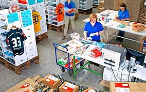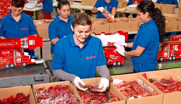 Die Verpackung von Medikamenten etwa wird in Handarbeit erledigt, auch bei Lebensmitteln spielt die Automatisierung kaum eine Rolle. Wenn beispielsweise der Großkunde Coca Cola spezielle Angebote wie in Trucks verpackte Dosen wünscht, packen viele Mitarbeiterinnen mit an, bis die Ware verkaufsfertig auf den Paletten liegt. "Im letzten Sommer hatten wir hier teilweise bis zu 60 Lkws von Coca Cola täglich", macht Klein die Dimension deutlich. Und es kommen immer wieder neue Kunden hinzu wie zuletzt der Bio-Anbieter Alnatura.
