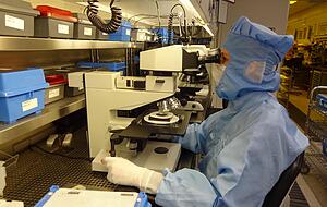 Heute arbeiten etwa 400 Vishay-Beschäftigte am Standort - nach der Krise 2009 ist die Belegschaft damit wieder um etwa 50 Mitarbeiter aufgestockt worden, berichtet Nadarzinski. Sie sind zum einen in Bereichen beschäftigt, die für den Gesamtkonzern mit seinen 22.000 Mitarbeitern zuständig sind, aber vor allem in den Produktionsabteilungen, die sich in zwei zentralen Flügeln des Gebäudekomplexes an der Theresienstraße befinden: Sie befassen sich mit der Herstellung von Silizium-Wafern sowie der Herstellung von Gallium-Arsenid-Wafern.